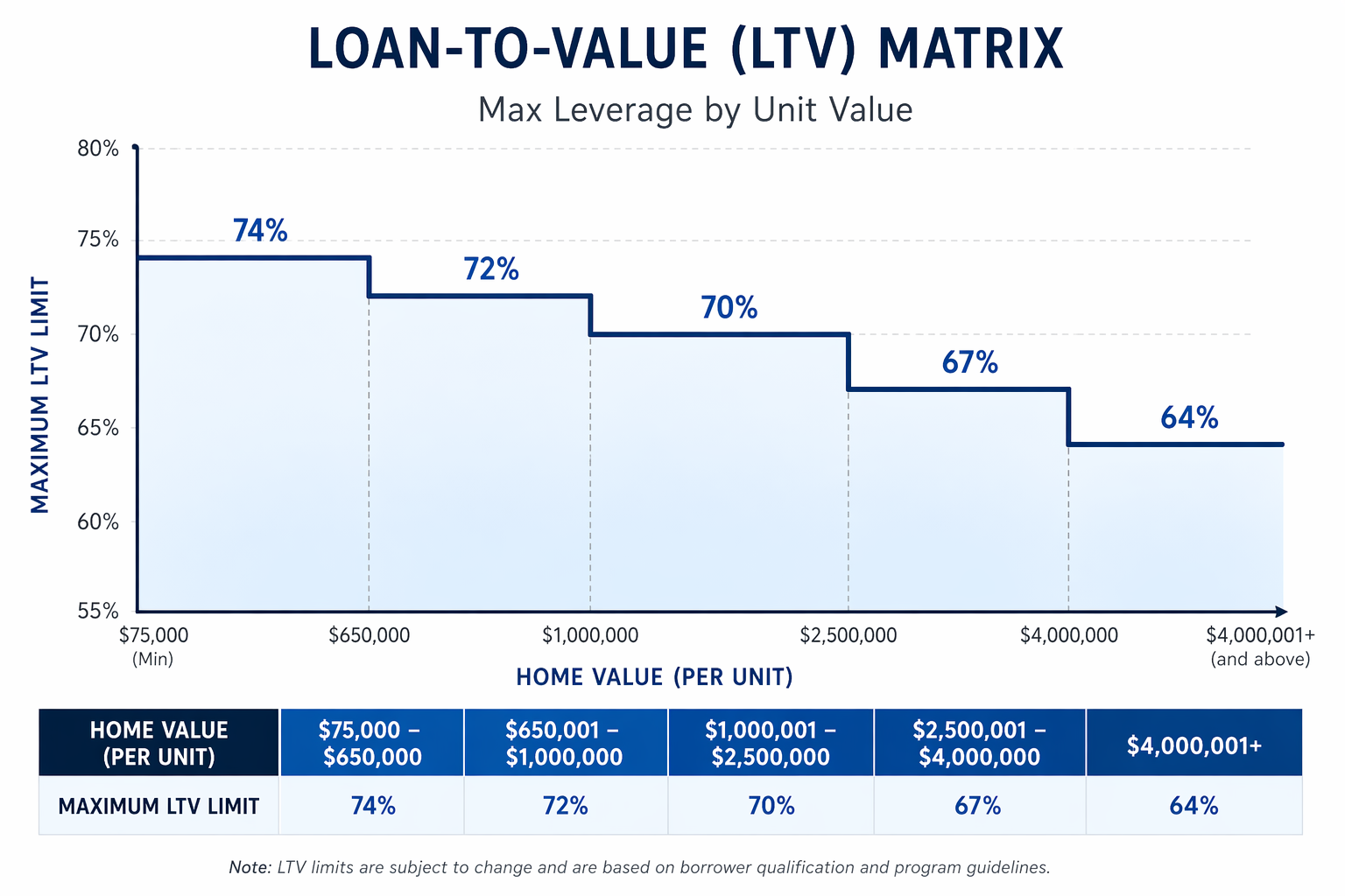 We offer competitive leverage based on the unit value of your homes. Our LTV limits are structured to support everything from entry-level builds to luxury estates.